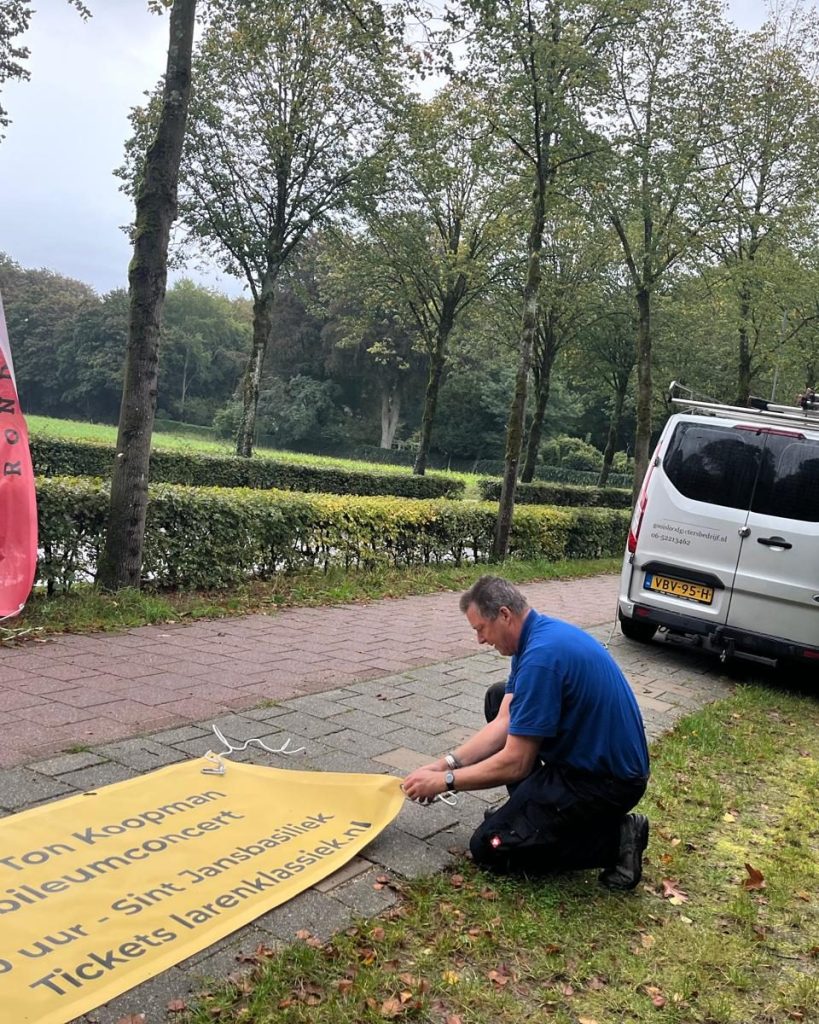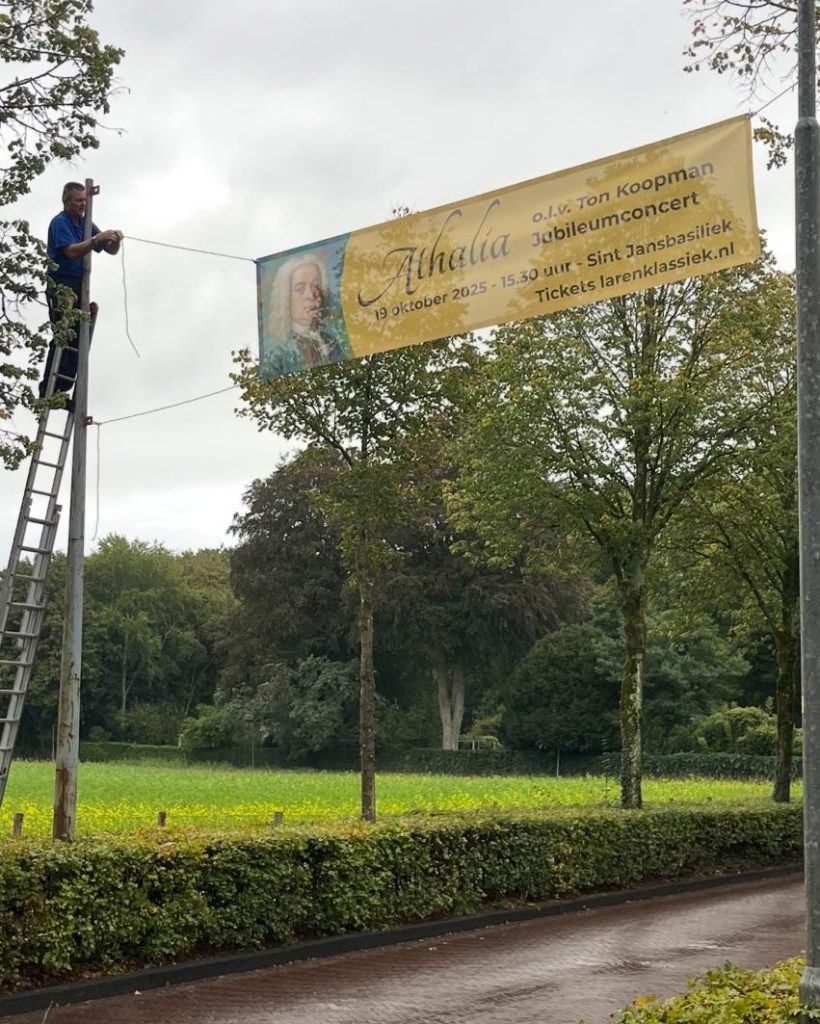 Samen met loodgietersbedrijf Cas Broeksema heeft heeft Mariette Nieuwboer vanmorgen vroeg de banners van Laren Jazz gewisseld voor het concert Athalia!