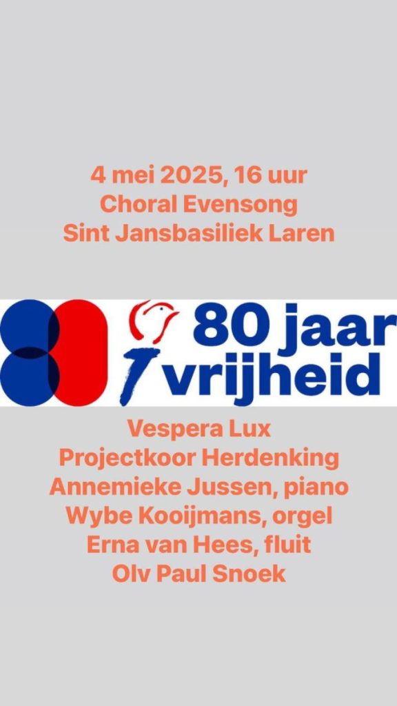 22 apr.- 80 jaar vrijheid met Vespera Lux, Projectkoor Herdenking, Annemiek Jussen, piano, Wybe Kooijmans orgel, Erna van Hees fluit, dirigent Paul Snoek. aanvang 16.00 uur