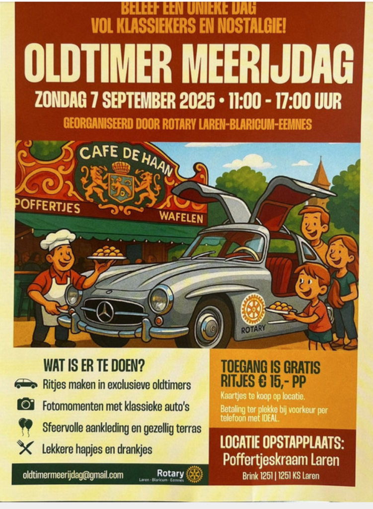 En dan is het morgen de Oldtimer Meerijdag in Laren.Wat dat precies inhoudt, vragen we aan Tineke Vermeer. Zij is van Rotaryclub Laren-Blaricum-Eemnes