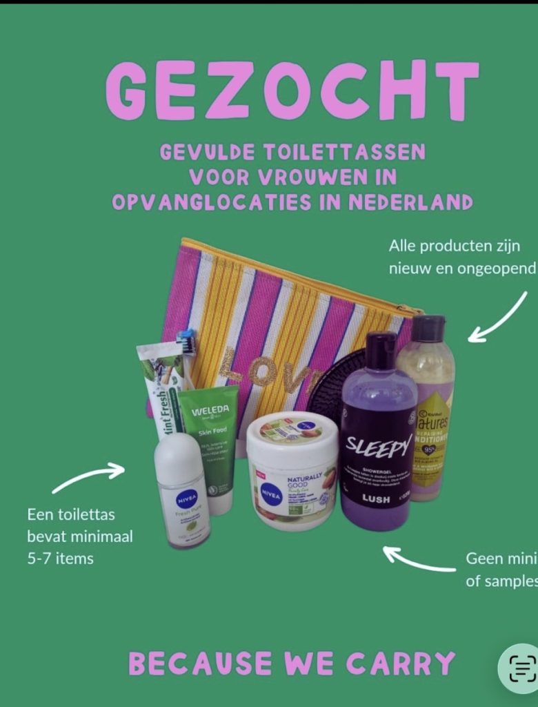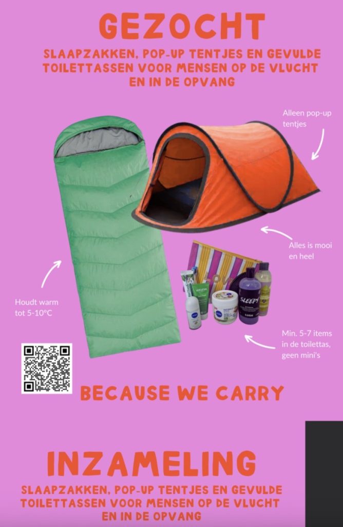 19 jan.-Larense Mariëlle de Blok komt in actie ivoor Because We Carry en zamelt daarvoor warme slaapzakken, pop-up tentjes en goed gevulde toilettassen in. De landelijke inzamelactie van Because We Carry is voor mensen op de vlucht en voor mensen in de opvang. Tot en met 28 januari kunnen warme, goede slaapzakken en pop-up tentjes worden ingeleverd in Laren! Ook nieuwe toilettassen voor dames gevuld met fijne verzorgingsproducten zijn zeer welkom.