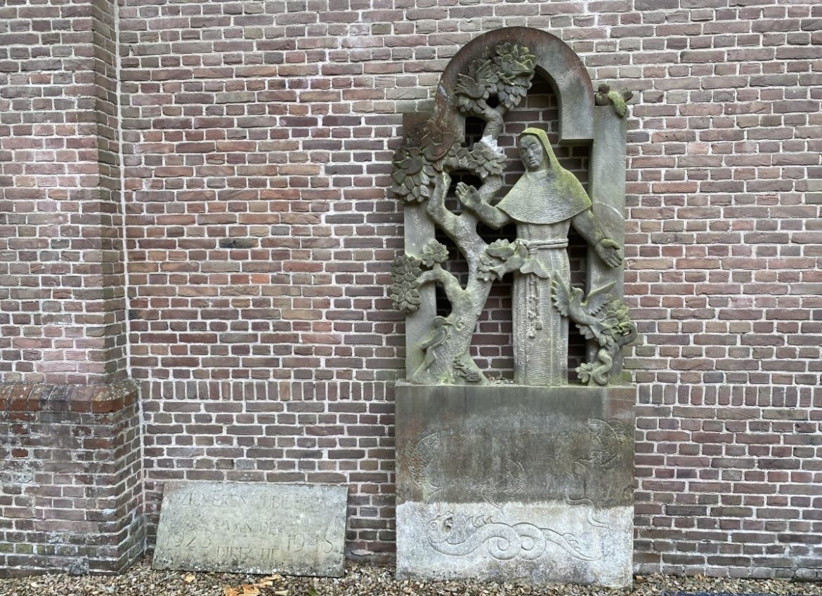 De afgelopen week werd ik in het Brinkhuis aangesproken door de heer Ton Muijen na afloop van mijn lezing voor Versa Welzijn in het kader van de juni-kunstmaand. Of ik iets meer wist over het stenen beeldreliëf in de kloostertuin tegen de muur van de basiliek, gemaakt door Willy Mignot? Een voorstelling van Sint Franciscus, die spreekt tot de vogels en vissen. Met name was hij geïnteresseerd hoe het daar gekomen is. Zelf had hij al gevonden dat het beeldreliëf oorspronkelijk was geplaatst in 1948 bij ‘Vulling’s Band-,Veter-, en Elastiekfabrieken N.V. in Heeze ter gelegenheid van een zilveren jubileum van drie directieleden. Ik wist dat ik thuis in mijn archief- dat nodig weer eens opgeruimd moet worden- een boek had over deze Eindhovense beeldhouwer, die lange tijd in Laren woonde en door zijn kalkstenen beeld ‘De Schaapherder’ op het gazon naast de Johanneskerk in ons dorp een zekere bekendheid geniet. Na een tijdje zoeken vond ik het door zijn zoon Marcel fraai uitgegeven boek ‘Willy Mignot 1915-1972, een vergeten beeldhouwer’, geschreven door kunsthistoricus Marike van der Knaap. Een kadotje destijds voor mij van dr.ir. André Schrikker (die ik op zijn racefiets fietsend door het dorp node mis), zoon van de bekende Larense beeldhouwer Kees Schrikker. Willy Mignot kwam uit een degelijke conservatief-katholieke fabrikanten familie. Het lag voor de hand dat hij net als zijn broers een plaats zou krijgen in de leiding van de succesvolle sigaren- en sigarettenfabriek Mignot & De Block, het bedrijf van zijn vader en grootvader, maar studeren vond hij volstrekt overbodig, hij wilde schilder worden en gaf aan naar de Rijksacademie in Amsterdam te willen. Voordat hij toelatingsexamen deed, nam hij twee jaar teken- en schilderles bij prof. Gé Röling (de vader van de huidige kunstenares Marthe Röling). Aan de Stadhouderskade studeerde hij tussen 1938-1946 , eerst, 22 jaar oud, in de schildersklas van Prof. Jurres. Tot het studieprogramma behoorde een dag verplicht boetseren De materie klei boeide hem dermate dat hij overstapte naar de beeldhouwklas van professor Jan Bronner, dé leermeester van een hele generatie Nederlandse beeldhouwers. Het artistiek-culturele klimaat in Amsterdam maakte de fabrikantenzoon uit Eindhoven tot een eenling; voor mede studenten een jongen uit een andere wereld, voor zijn familie een volgelvrij verklaarde, een vreemde eend in de bijt.