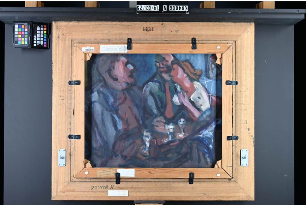 Bij het gereedmaken van het schilderij Landschap te Laren, gezicht uit dakraam voor de tentoonstelling, werd op de achterzijde een voorstelling aangetroffen: een café-scène met borrelende mensen. Wellicht had Fiedler in de schaarste van de oorlogsjaren het doek hergebruikt. Voor de tentoonstelling is een speciaal meubel gemaakt zodat je het aan beide kanten kunt zien.