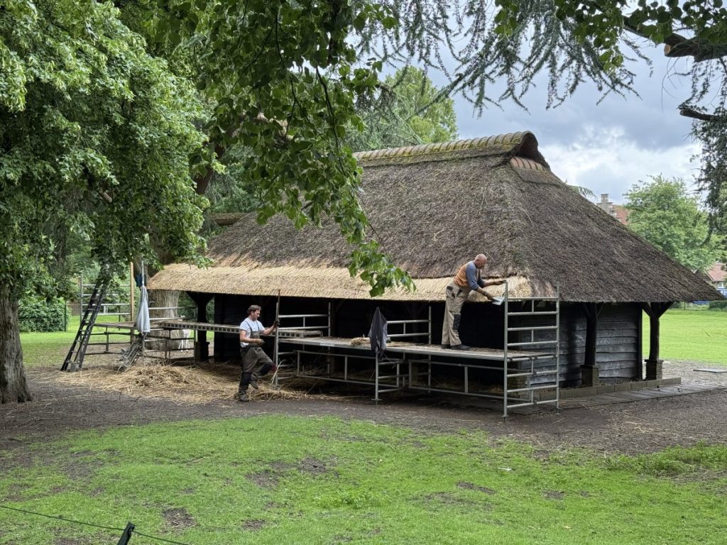 11 juni.-Rietdekkers De Boer & Zn. hebben het dak van de stal in het hertenkamp weer prachtig bijgewerkt. Blijft mooi om te zien hoe ze dat altijd weer doen!