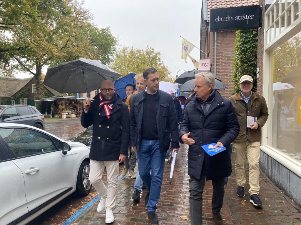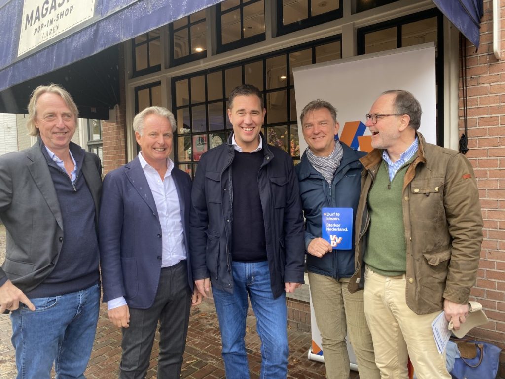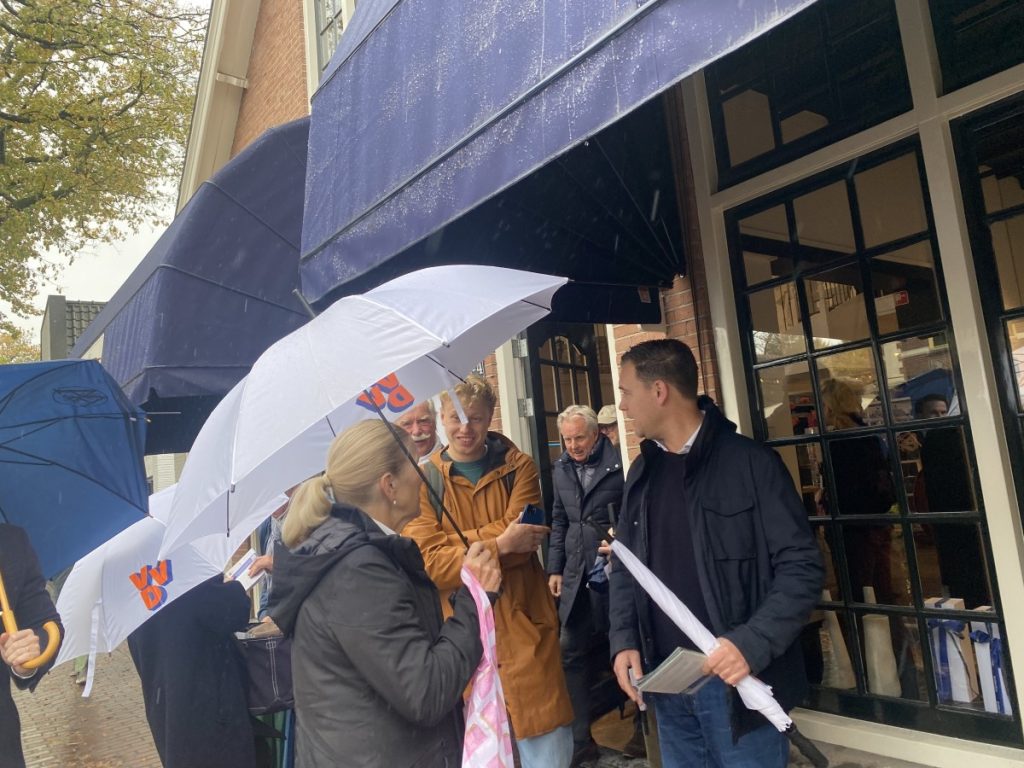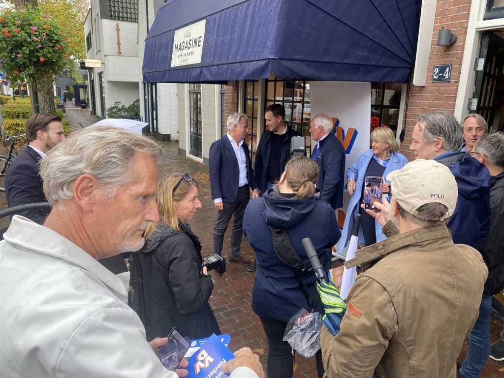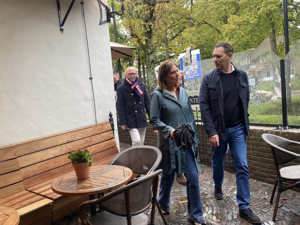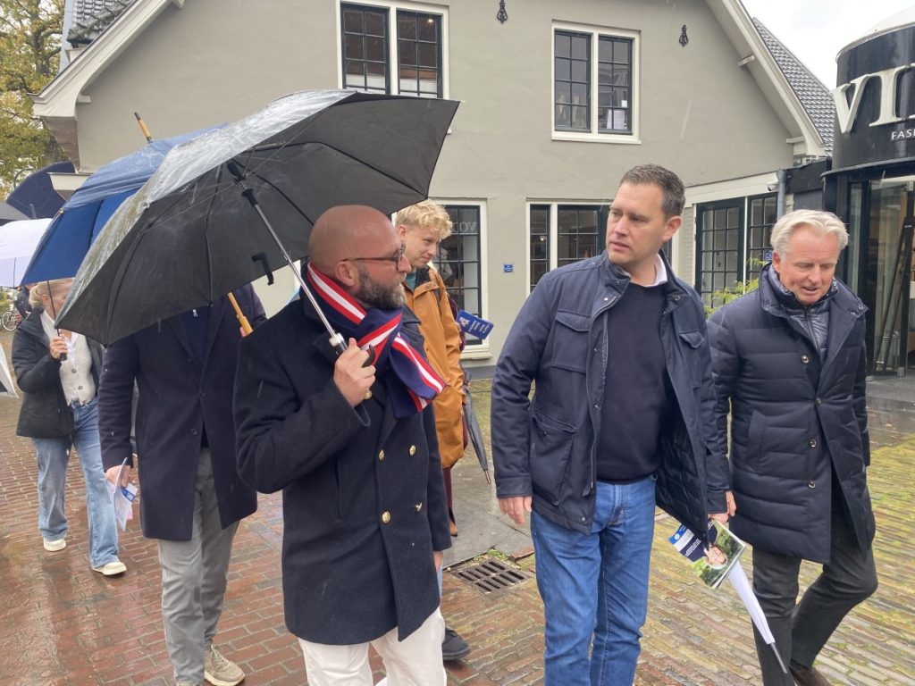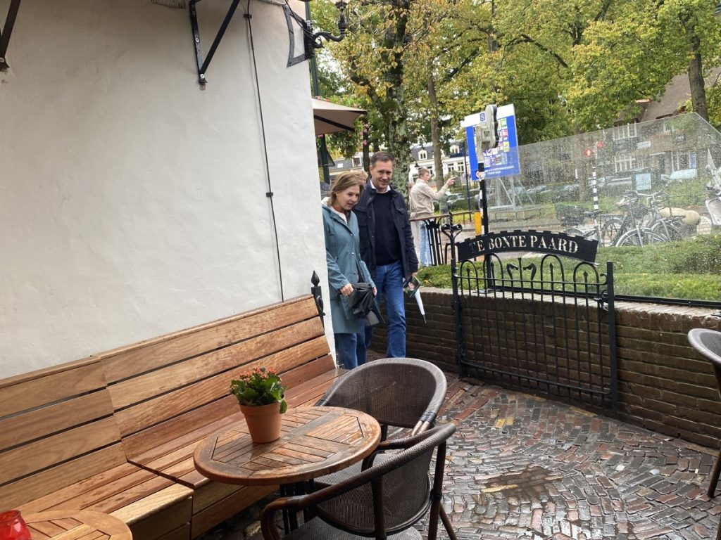 25 okt. .-Vandaag kwam VVD minister Eelco Heinen iop bezoek in een regenachtig. De minister begon in het pas geopende ‘Magasine’ waar hij uitvoerig met de eigenaren sprak.Verder waren er weinig mensen op straat vandaar dat de Nieuweweg voor een bezoek werd overgeslagen snel werd uitgeweken naar Larens oudste kroeg t’ Bonte Paard. Daar wachtte hem een aubade door leden van mannenkoor de Speuit.