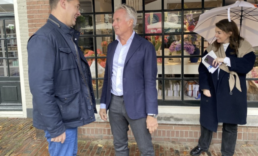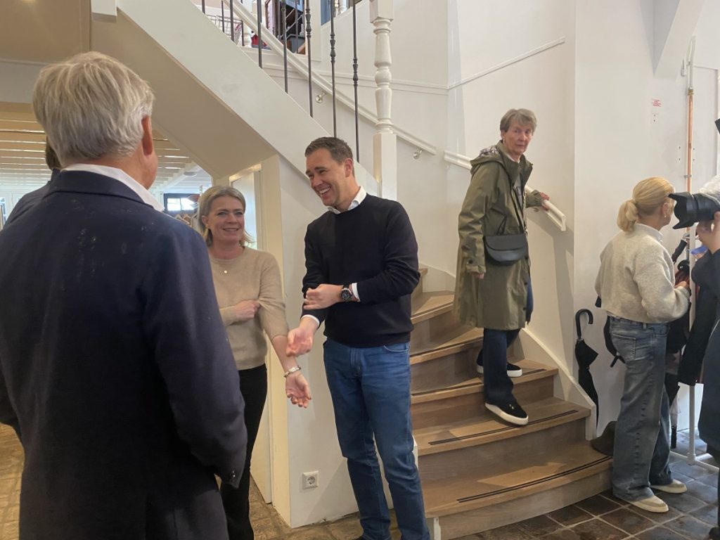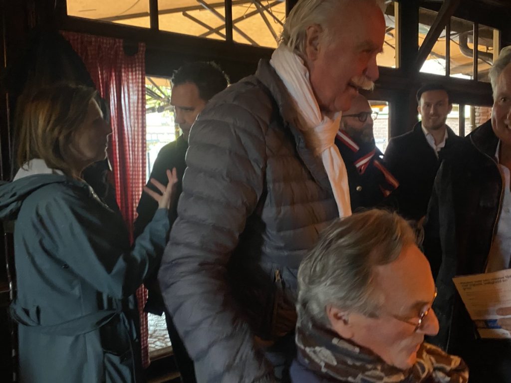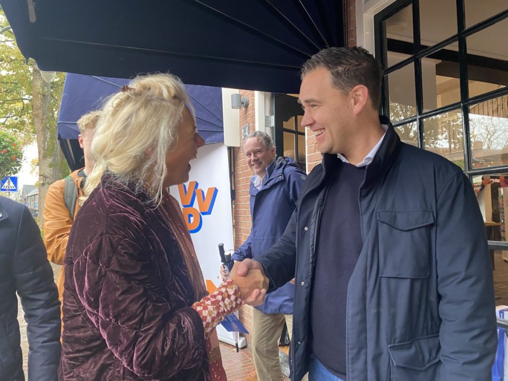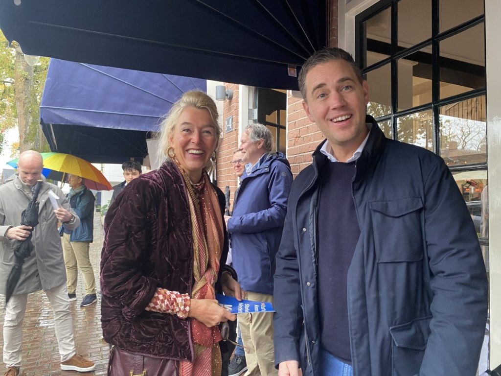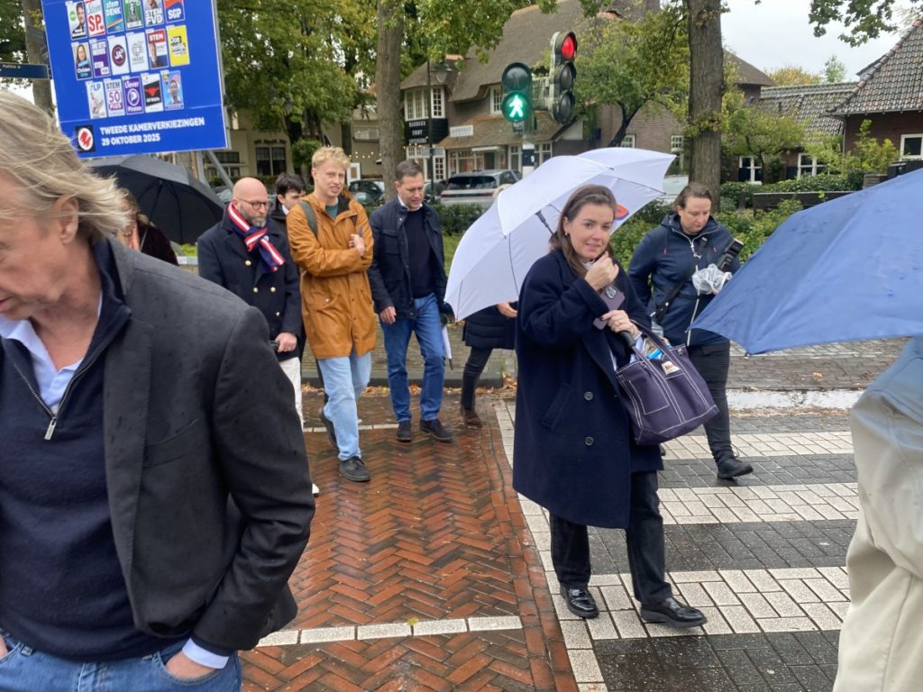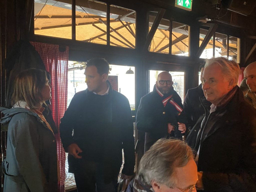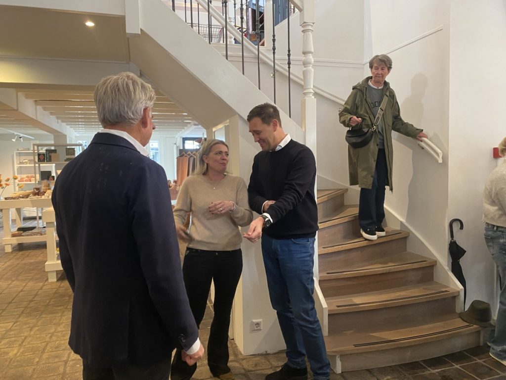 25 okt. .-Vandaag kwam VVD minister Eelco Heinen iop bezoek in een regenachtig. De minister begon in het pas geopende ‘Magasine’ waar hij uitvoerig met de eigenaren sprak.Verder waren er weinig mensen op straat vandaar dat de Nieuweweg voor een bezoek werd overgeslagen snel werd uitgeweken naar Larens oudste kroeg t’ Bonte Paard. Daar wachtte hem een aubade door leden van mannenkoor de Speuit.