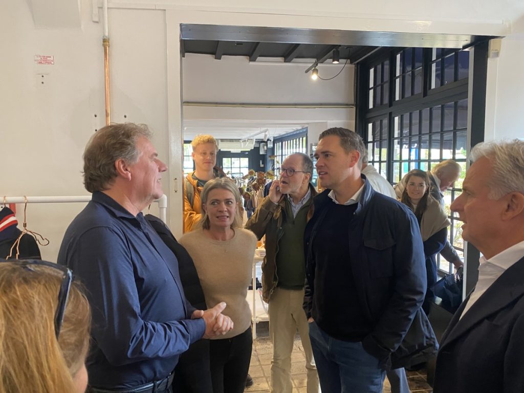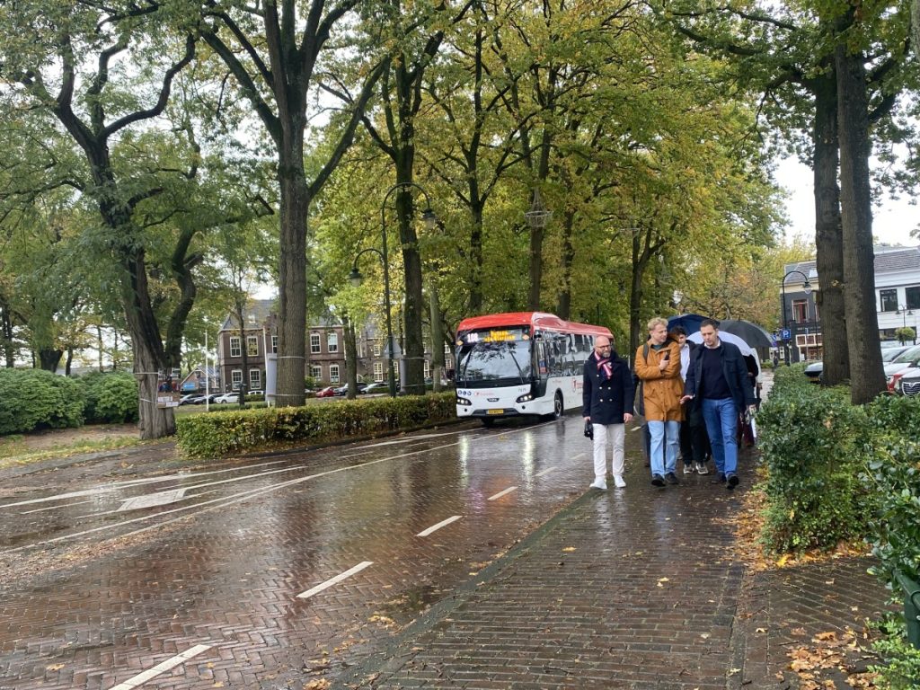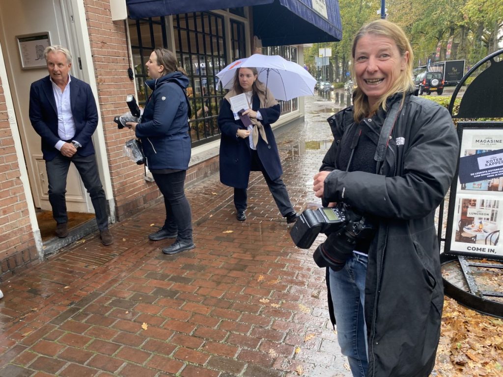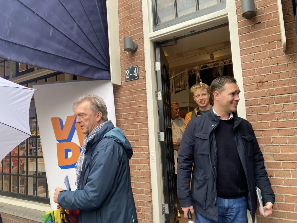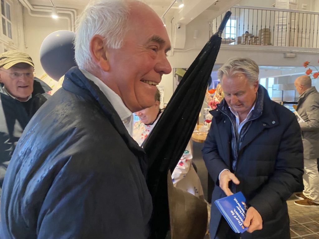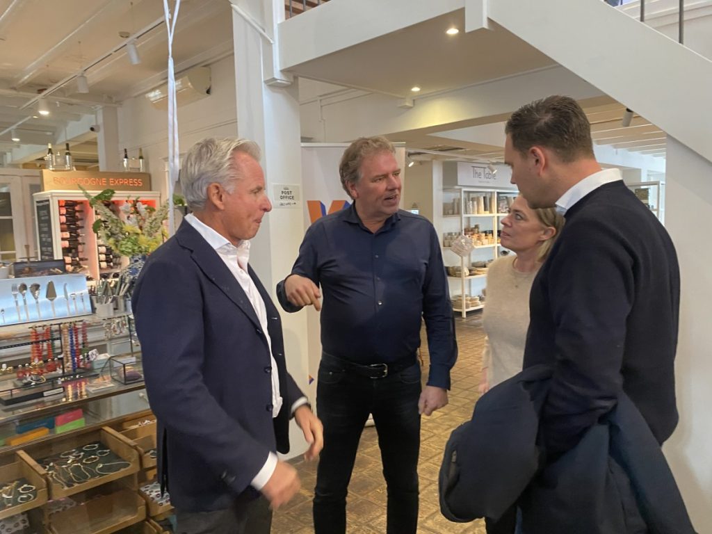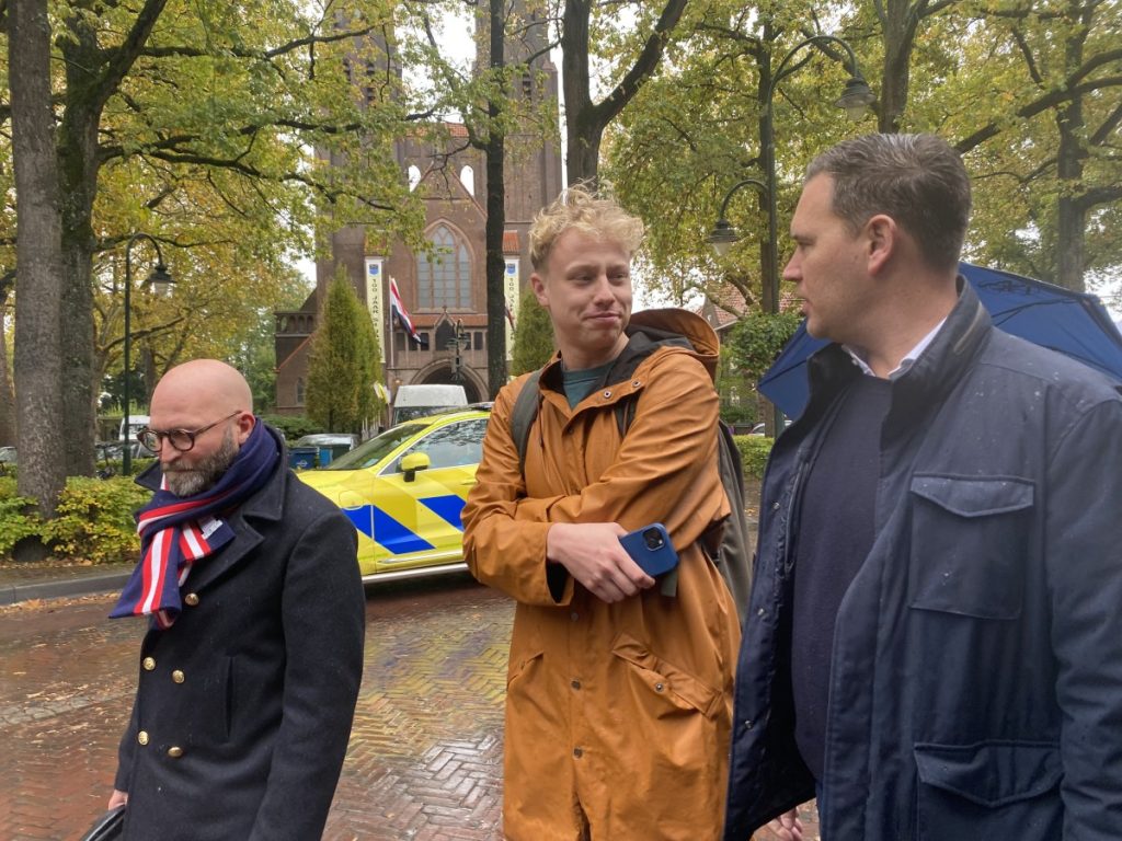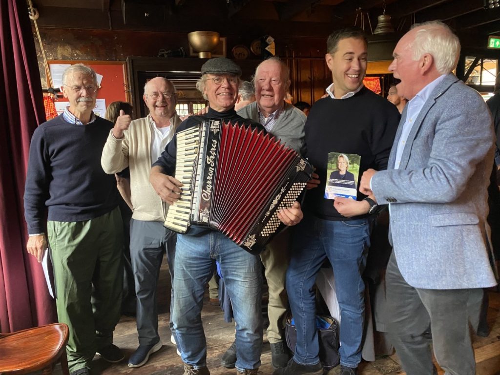 25 okt. .-Vandaag kwam VVD minister Eelco Heinen iop bezoek in een regenachtig. De minister begon in het pas geopende ‘Magasine’ waar hij uitvoerig met de eigenaren sprak.Verder waren er weinig mensen op straat vandaar dat de Nieuweweg voor een bezoek werd overgeslagen snel werd uitgeweken naar Larens oudste kroeg t’ Bonte Paard. Daar wachtte hem een aubade door leden van mannenkoor de Speuit.