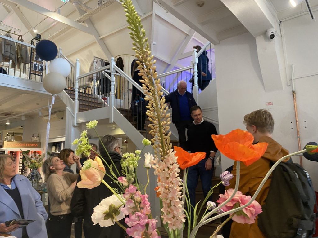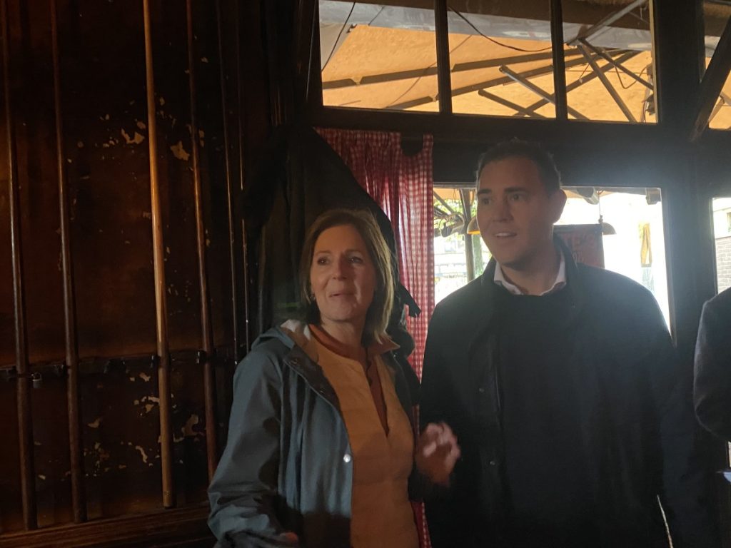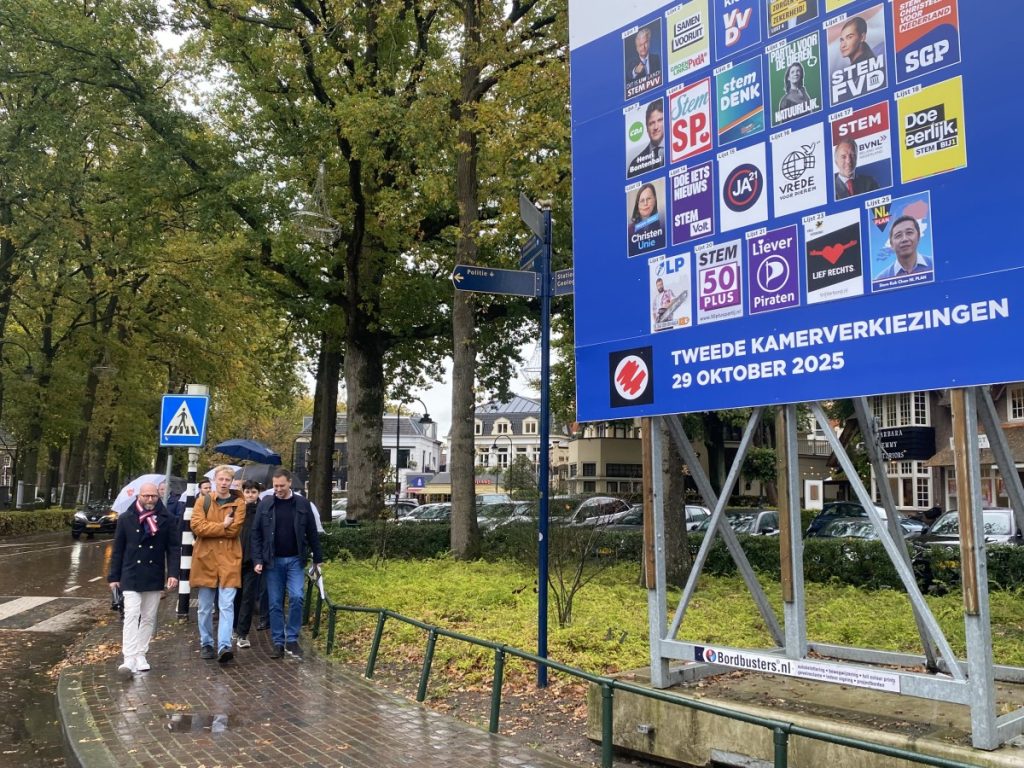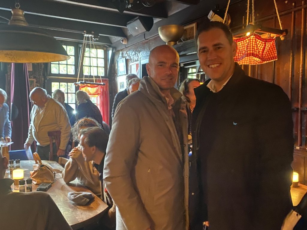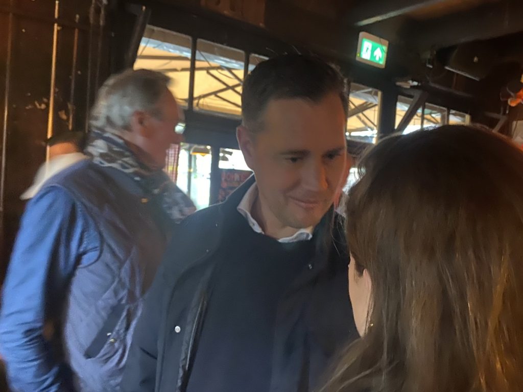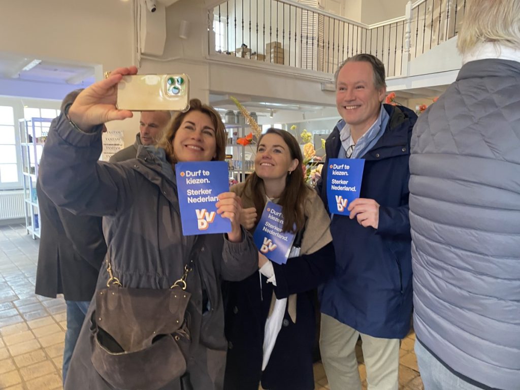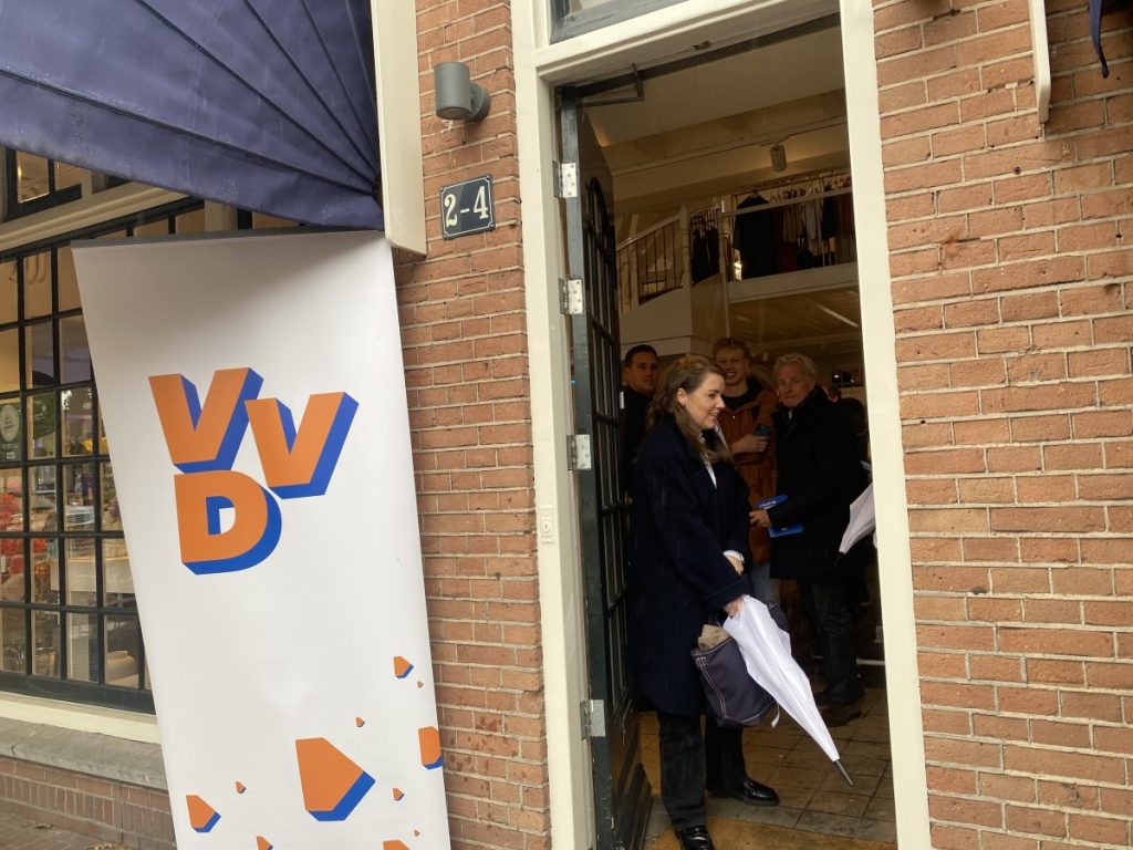25 okt. .-Vandaag kwam VVD minister Eelco Heinen iop bezoek in een regenachtig. De minister begon in het pas geopende ‘Magasine’ waar hij uitvoerig met de eigenaren sprak.Verder waren er weinig mensen op straat vandaar dat de Nieuweweg voor een bezoek werd overgeslagen snel werd uitgeweken naar Larens oudste kroeg t’ Bonte Paard. Daar wachtte hem een aubade door leden van mannenkoor de Speuit.