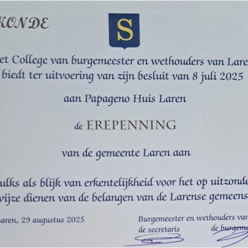 Burgemeester Joan de Zwart-Bloch: “Dankzij de niet-aflatende inzet van Aaltje van Zweden en de circa 80 betrokken vrijwilligers is Het Papageno Huis uitgegroeid tot een plek van ontmoeting en inclusie. Er is een lunchrestaurant, er zijn culturele activiteiten en er vindt samenwerking plaats met lokale instellingen als Singer Laren en Scholengemeenschap Laar & Berg. Het Papageno Huis verrijkt het sociale en culturele leven in Laren en draagt op unieke wijze bij aan een inclusieve gemeenschap waarin iedereen meetelt en waar voor iedereen een eigen uniek plek is.”