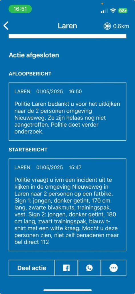 Er is een signalement van de verdachten verspreid via Burgernet. Er wordt gezocht naar twee donker getinte jongens op een fatbike, beiden dragen een trainingspak.