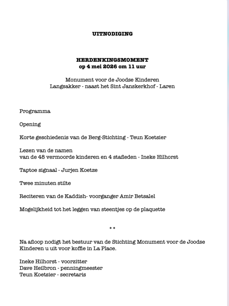 Herdenkingsmoment Bergstichting 30 april 2026 30 apr.- Deel dit bericht via Facebook: Share op Facebook (Opent in een nieuw venster) Facebook Vind ik leuk:Vind-ik-leuk Aan het laden... Delen