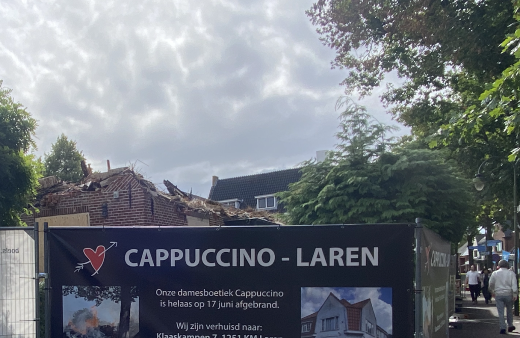 26 mrt.-De inwoners van Laren kijken al tien maanden uit op een gapend gat op de plek waar de kledingzaken Cappuccino en Sisera zaten. Wat ooit een karakteristieke boerderij was, is sindsdien vooral een stille herinnering aan de verwoestende brand van afgelopen zomer. Hekken met reclameposters onttrekken de resten aan het zicht, alleen de muren van Sint Janstraat 7 staan nog overeind.