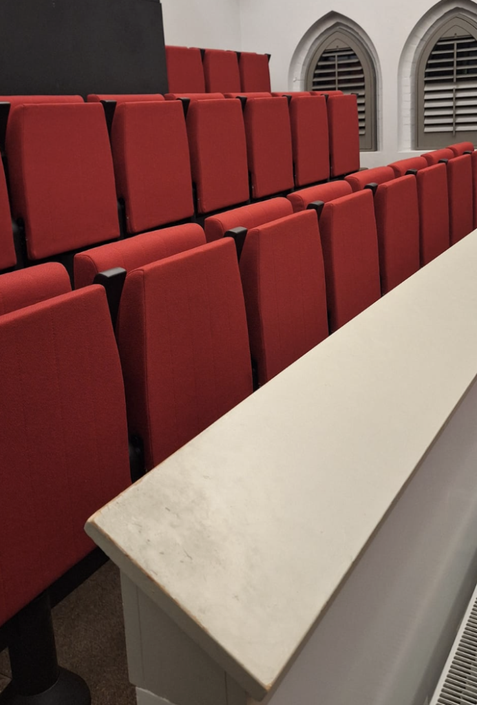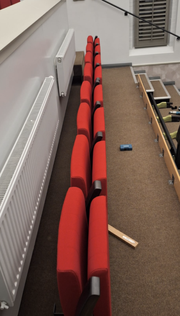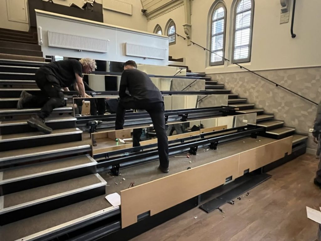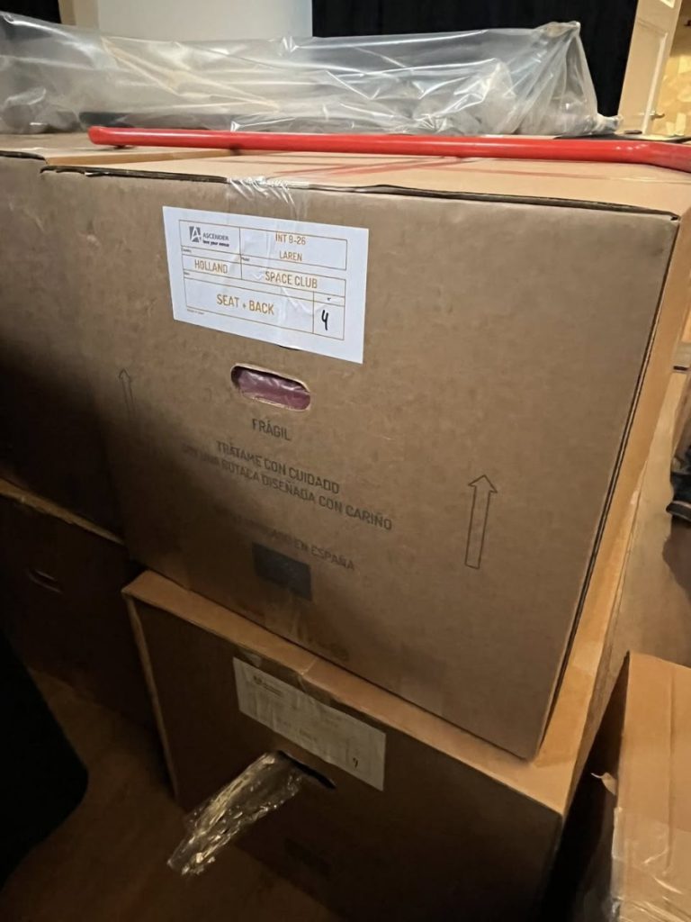 2 apr.-De gekleurde oude stoelen in het Brinkhuistheater zijn al weg (worden opnieuw gebruikt voor een klein theatertje in Bergen) en de nieuwe stoelen staan klaar in de doos