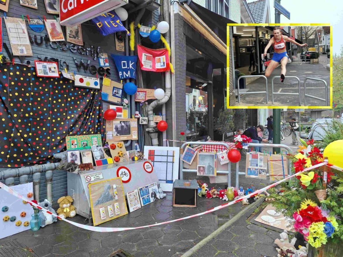 Mijn overbuurvrouw schrok zich helemaal rot, toen ze het kunstwerk voor het eerst zag. In de Gooi- en Eemlander reageert ze dan ook: ‘Ik zag allemaal bloemen en kinderknuffels liggen. Ik dacht even dat er iets ergs gebeurd was, een ongeluk of zo, maar toen ik beter keek, zag ik dat het iets met Mondriaan te maken had. Wat mij betreft hadden ze dat best wel ergens op een bordje erbij kunnen zetten. Dat voorkomt schrik.’