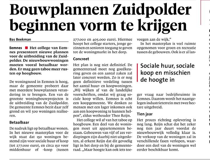 21 mei.-Karel Loeff, fractievoorzitter van Larens Behoud reageert op het artikel in de Gooi- en eemlander over eventuele hoogbouw in Eemnes