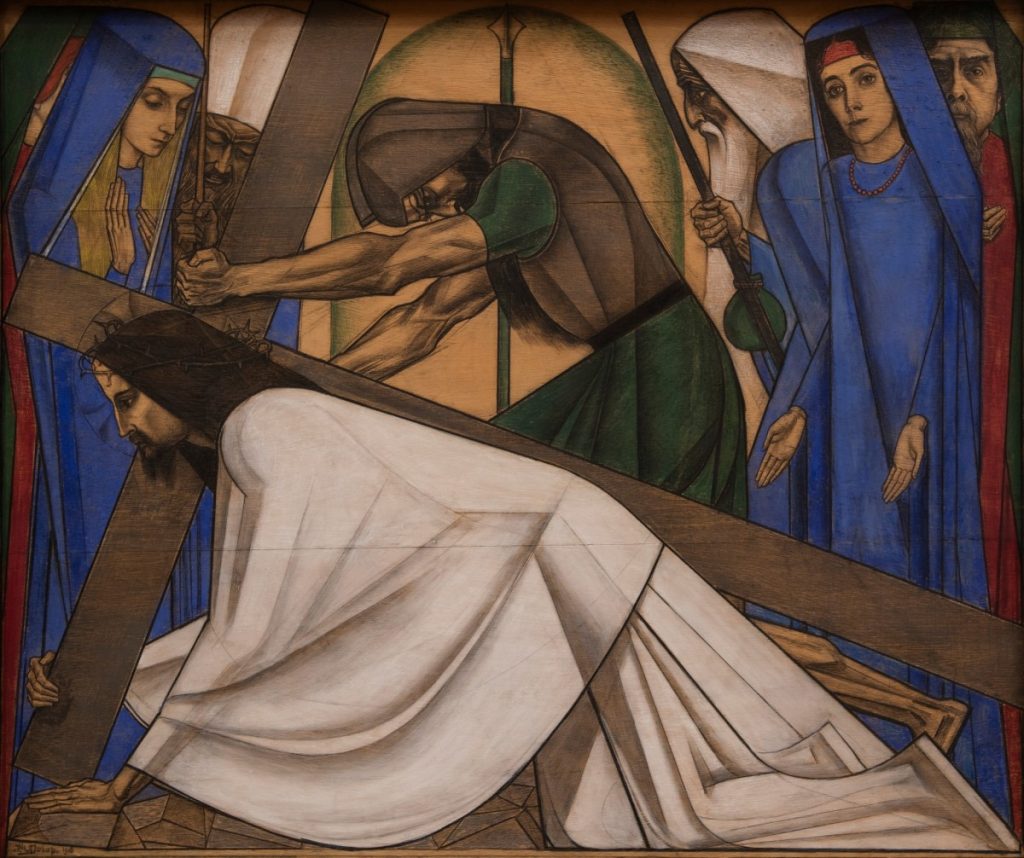 Toorop identificeert zich persoonlijk met het lijdensverhaal van Christus: in de rechterhoek van statie 7 heeft Toorop zichzelf een bescheiden plaats gegeven als een verscholen zondaar.
