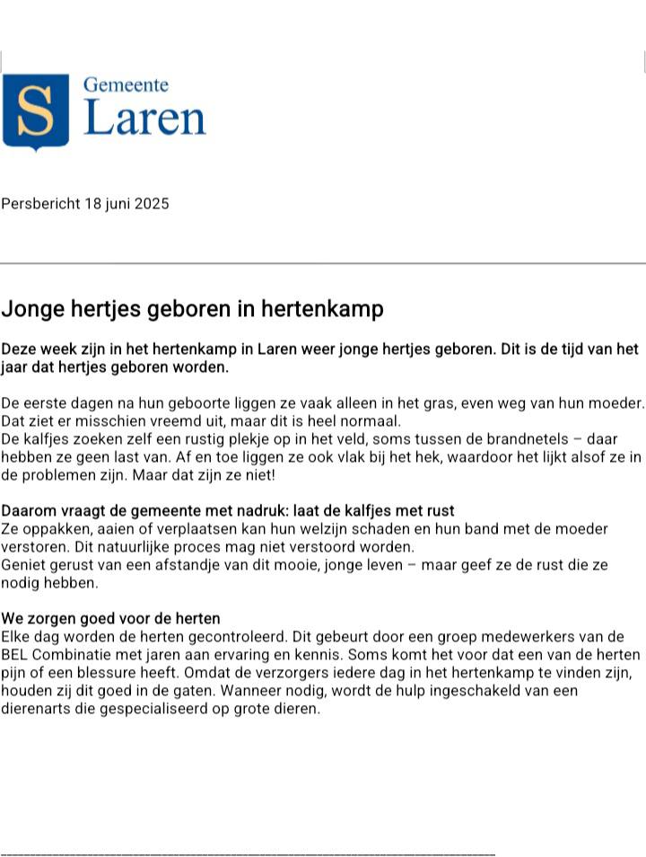 Jonge hertjes… 20 juni 2025 20 juni.- Bron en foto: Gemeente/ Larens Behoud Deel dit bericht via Facebook: Klik om te delen op Facebook (Opent in een nieuw venster) Facebook Vind ik leuk:Vind-ik-leuk Aan het laden... Delen