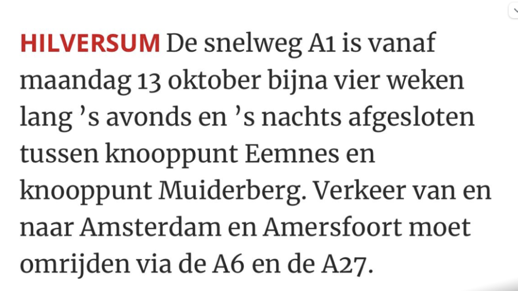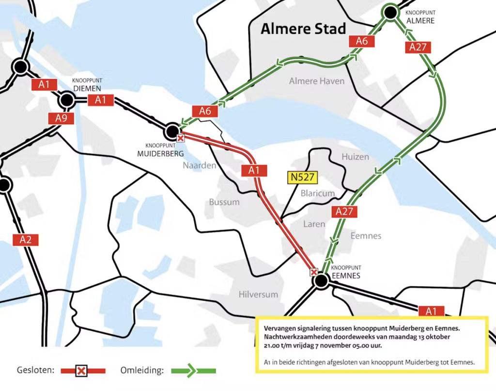- Tijdens de nachtafsluitingen (13 oktober tot en met 7 november) is de A1 dicht in beide richtingen tussen Muiderberg en Eemnes.
