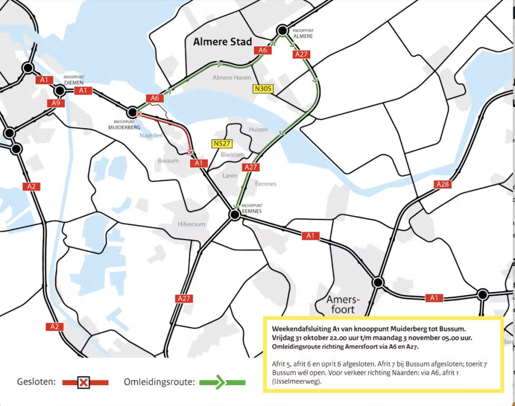 - Tijdens het weekend van 31 oktober tot en met 3 november 2025 is de A1 richting Amersfoort afgesloten tussen Muiderberg en afrit Bussum (7).