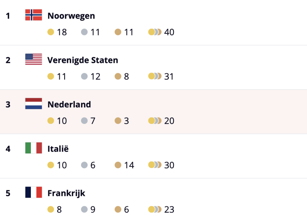21 febr.-Nederland staat met acht keer goud op Winterspelen vierde in het medailleklassement van de Olympische Winterspelen in Milaan. De shorttrackmannen wonnen gisterenavond de aflossing en langebaanschaatsster Antoinette Rijpma-de Jong won verrassend de 1500 meter.