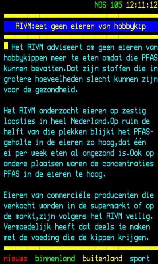 16 apr.- Nederlanders zouden geen eieren van hobbykippen meer mogen eten. Dat is een advies van het RIVM (Rijksinstituut voor Volksgezondheid en Milieu). Uit onderzoek blijkt dat de eieren PFAS kunnen bevatten, en dat is mogelijk schadelijk voor de gezondheid. Het instituut raadt aan om eieren in de winkel of op de markt te kopen. In ons land blijft het bestaande advies van kracht om maximaal 2 eieren van eigen kippen per week te eten.