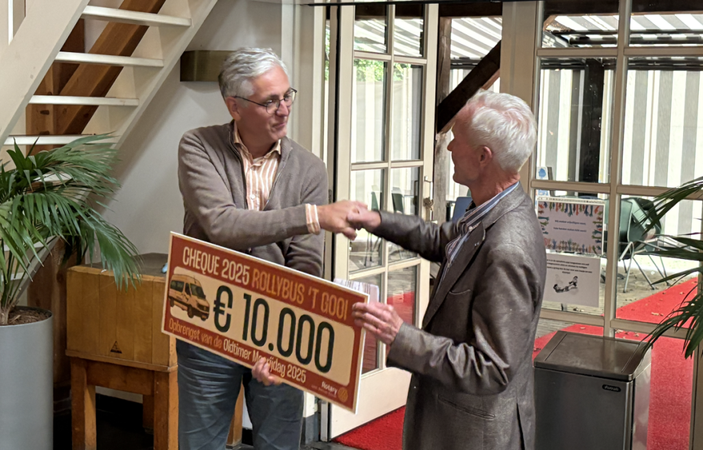 28 sept.-Op vrijdag 26 september heeft de voorzitter van de Rotary Laren Blaricum, de heer Michael Klok, een cheque van 10.000 euro overhandigd aan Ton de Jong, vice-voorzitter van de Rollybus.