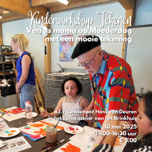 8 mei.-Verras je mama op Moederdag (11 mei) met een prachtige tekening die je op zaterdag 10 mei in het Brinkhuis Atelier maakt. Deze kinderworkshop doe je in een echt kunstatelier, met twee echte kunstenaars (Hans van Deuren & Charlotte Vis) op echt schilderspapier!