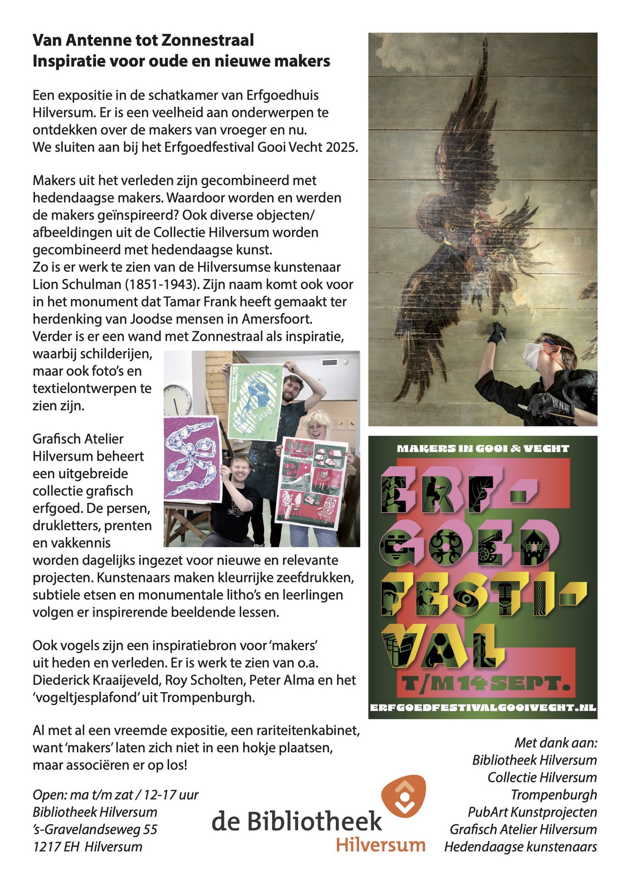| Agenda23 augustus: tijdens OPEN035: vrijheids catwalk met vrijheidsrokken op het marktplein in Hilversum. Nog t/m 13 september 2025: expositie Meesterlijk Boekweit in het leescafe van Bibliotheek Hilversum. Openingstijden bibliotheek! Nog t/m 13 september 2025: Van Antenne tot Zonnestraal, in het Erfgoedhuis Hilversum (locatie Bibliotheek Hilversum). Open van 14-17 uur. |