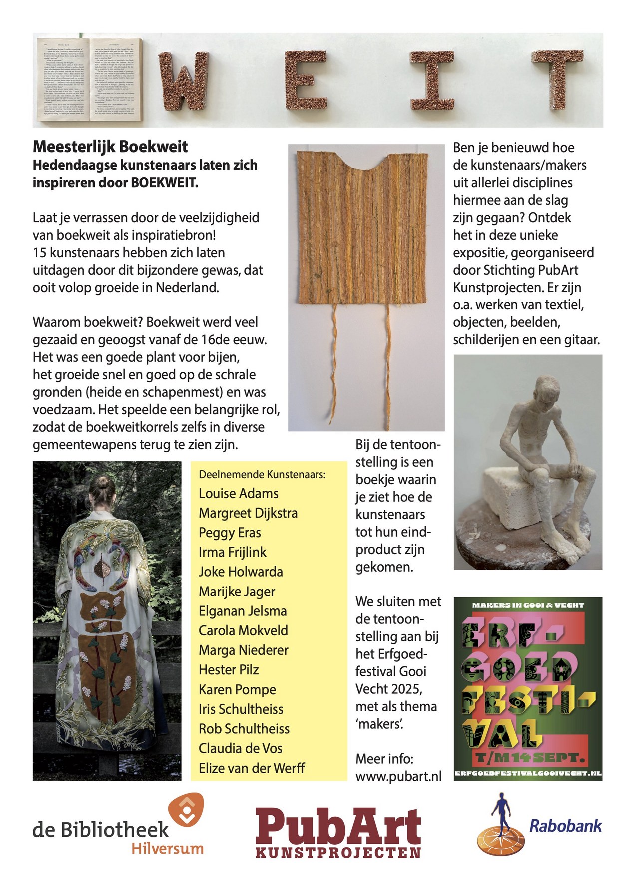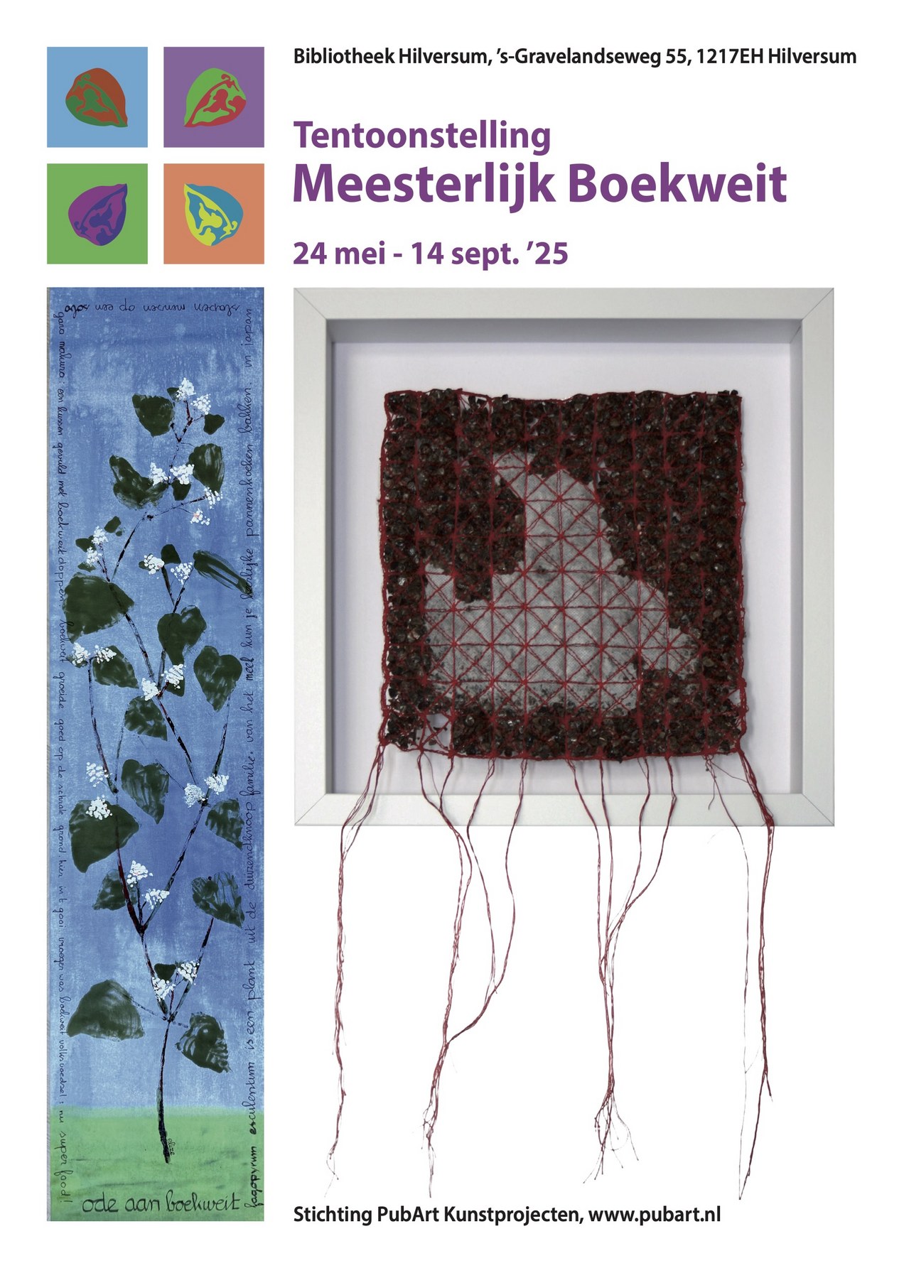 ![]() MEESTERLIJK BOEKWEIT Nog t/m 13 september 2025, Locatie: leescafe in Bibliotheek Hilversum. Hedendaagse kunstenaars/ makers in allerlei disciplines, laten zich inspireren door BOEKWEIT. Laat je verrassen door de veelzijdigheid van boekweit als inspiratiebron! 15 kunstenaars hebben zich laten uitdagen door dit bijzondere gewas, dat ooit volop groeide in het Gooi. Waarom boekweit? Boekweit werd veel gezaaid en geoogst in het Gooi. Het was een goede plant voor bijen, het groeide snel en goed op de Gooise gronden, was voedzaam en speelde een belangrijke rol in de regio – zelfs in de gemeentewapens van Hilversum en Gooise Meren zie je de korrels terug. Benieuwd hoe de kunstenaars hiermee aan de slag zijn gegaan? Ontdek het in deze unieke expositie, georganiseerd door PubArt Kunstprojecten. Er zijn o.a. wandkleden, grafische werken, keramiek, aquarellen en een gitaar. Ter plekke en op de website vind je meer informatie over boekweit en de kunstwerken. Het kunstproject sluit aan bij het Erfgoedfestival Gooi Vecht, met als thema Makers. De expositie wordt gepresenteerd op de expowand in het leescafe van Bibliotheek Hilversum. Deelnemende kunstenaars: Louise Adams, Margreet Dijkstra, Peggy Eras, Irma Frijlink, Joke Holwarda, Marijke Jager Burggraaff, Elganan Jelsma, Carola Mokveld, Marga Niederer van Huizen, Hester Pilz, Karen Pompe, Iris Schultheiss, Rob Schultheiss, Claudia de Vos, Elize van der Werff. Bibliotheek Hilversum, ’s-Gravelandseweg 55 te Hilversum Open: maandag t/m zaterdag www.bibliotheekhilversum.nl www.erfgoedfestivalgooivecht.nl Meer info op de website www.pubart.nl |