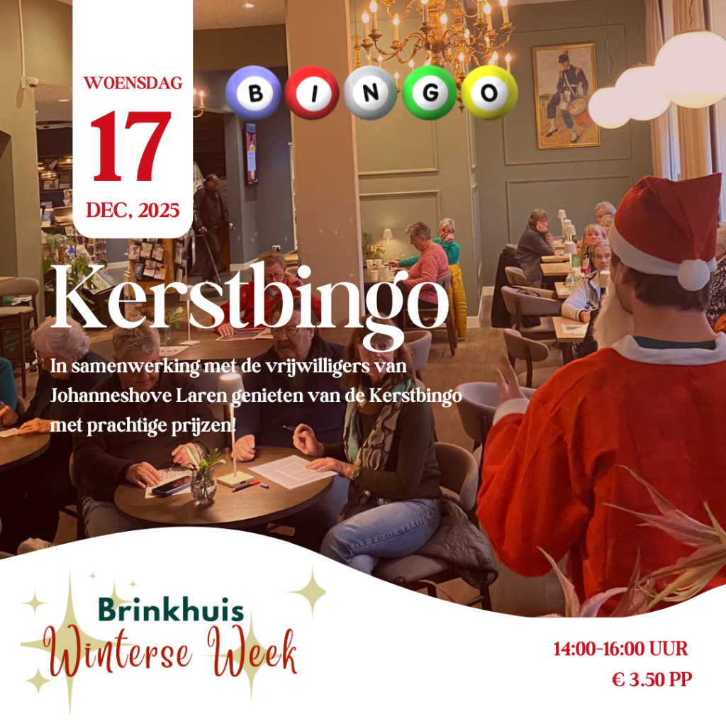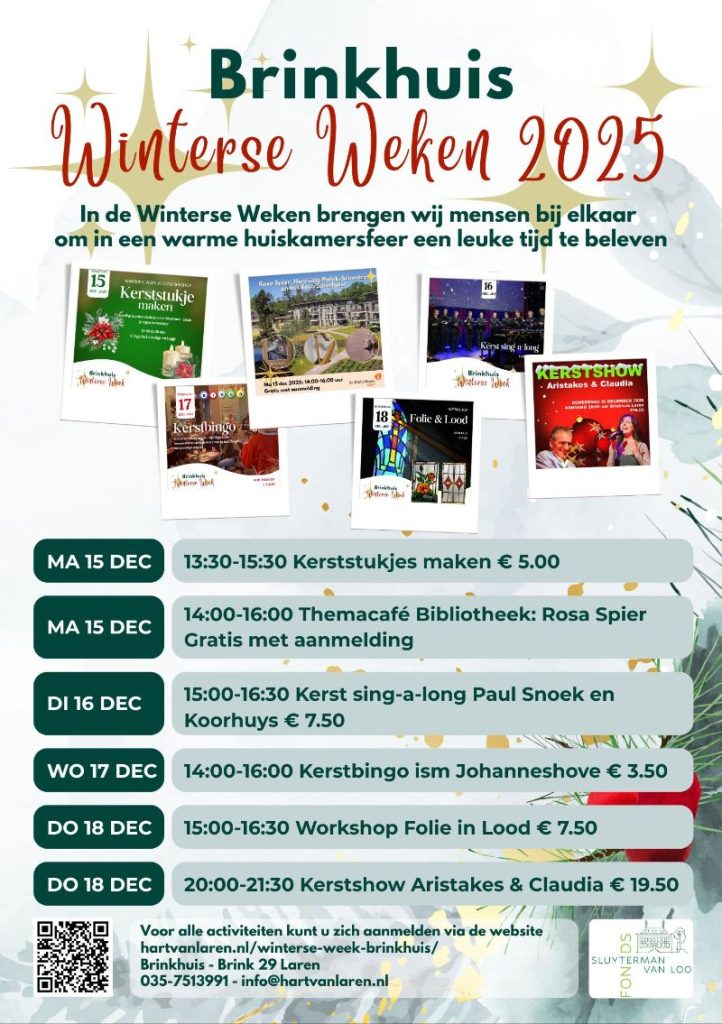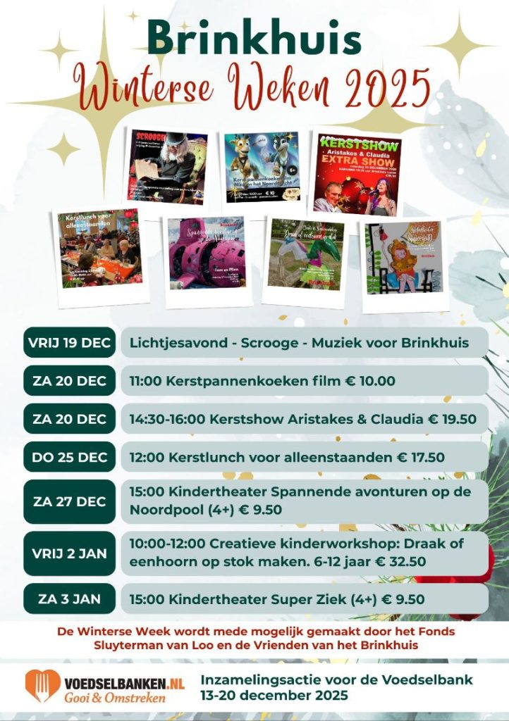 | Vanaf 15 december beginnen de Winterse weken weer in het Brinkhuis met leuke workshops, kerststhows, kerstlunch voor alleenstaanden, kerstbingo en kindertheater. Kijk op de site of haal de flyer in het Brinkhuis! |