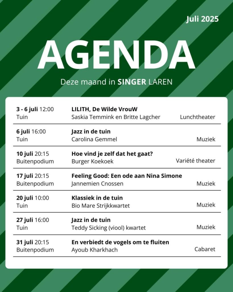 1 juli.-Deze maand juli zit je goed bij Singer Laren. Van jazzy tuinsessies tot scherpe verhalen en een ode aan Nina Simone. Er valt genoeg te ontdekken. Pak je agenda erbij: